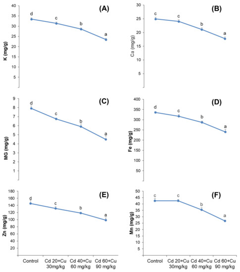Cadmium and copper combined effect on distribution of macro-nutrients (K+, Ca+, and Mg2+), and micro-nutrients (Fe+, Zn and Mn) in pigeon pea is shown in Figure 6. Cadmium (Cd) and Copper (Cu) cumulative stress significantly inhibited both macro and micro nutrients distributions among the plant’s organs, where maximum reductions of 29.98% in K+,28.76% in Ca+ and 43.23% in Mg2+ was detected at (60 + 90 mg/kg) Cd and Cu combined stress in the leaves of pigeon pea. Similarly, 28.30%, 32.28%, and 37.14% reduction in the micro-nutrients (Fe+, Zn, and Mn, respectively) were monitored in the leaves of pigeon pea exposed to (60 + 90 mg/kg) Cd and Cu stress.