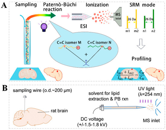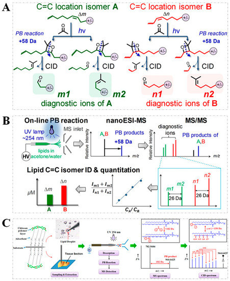 Additionally, to allow the PB reaction to be available for the characterization of C=C locations in unsaturated lipids from broad types of samples, different sampling methods have been proposed. For instance, a polymer coating transfer enrichment (PCTE) method coupled with the PB reaction was developed for a nanoelectrospray ionization mass spectrometry (PCTE-PB-nanoESI-MS) analysis of unsaturated lipids in human biofluid samples [48]. Similarly, the in vivo and microscale profiling of lipid C=C location isomers in biological tissues has been realized by combining the PB reaction with surface-coated probe nanoESI-MS (SCP-PB-nanoESI-MS) [47]. In SCP-PB-nanoESI-MS analysis (Figure 2C), a biocompatible SPEM probe with a nanospray tip was used for the extraction and ionization of lipids from a biological tissue sample, and then the solvent containing the PB regents was used to desorb lipids enriched on the SPEM probe. Subsequently, the PB reaction was triggered by irradiation with an UV light at 254 nm. After that, the high voltage was applied on the SPEM probe for nanoESI-MS/MS and generated diagnostic ions corresponding to the location of the C=C bond.