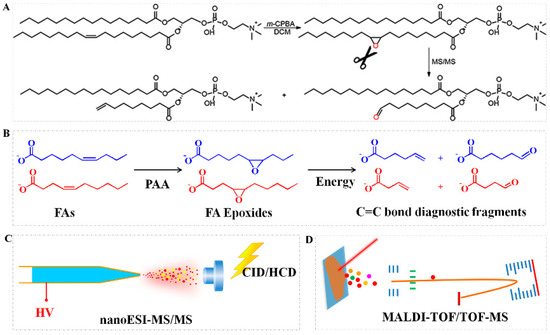 The mechanism of epoxidation reaction induced by m−CPBA (A) (reproduced permission from Ref. [24]. Copyright (2019) American Chemical Society.) and PAA (B) to produce diagnostic fragment ion pair. The workflow of PAA epoxidation in combination with nanoESI−MS/MS (C) for assigning C=C bond in FAs from solution and MALDI−TOF/TOF−MS (D) for spatial characterization of C=C bond in FAs from tissue sections (note: Figure 4B–D, reproduced from Ref. [5] with permission from the Royal Society of Chemistry).