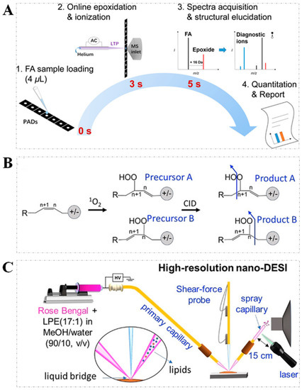 (A) The workflow of online epoxidation/ionization of unsaturated FAs on paper strips by LTP−MS (reproduced permission from Ref. [55]. Copyright (2018) American Chemical Society); (B) the mechanism of C=C bond oxidation by 1O2 and fragmentation via CID to yield products; (C) the experimental setup of online 1O2 derivatization of C=C bond combined with nano−DESI−MS (note: Figure 5B,C, reproduced from Ref. with permission from permission of Wiley-VCH GmbH).