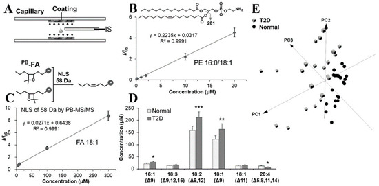 Quantitation of lipids in biofluid samples by PCTE−PB−nanoESI−MS (reproduced from Ref. [48] with permission from Wiley-VCH Verlag GmbH & Co. KGaA, Weinheim). (A) Incorporation of internal standards by polymer coating; (B) calibration curve of PE 16:0/18:1; (C) calibration curve of FA 18:1. Inset shows the fragmentation of derivatized FAs; (D) comparison of absolute concentration of some major free FAs in normal and T2D blood samples; (E) 3D PCA plot of the data of major free FAs in normal and T2D blood samples. (Note: neutral loss scan (NLS), type 2 diabetes (T2D), * p < 0.05, ** p < 0.01, *** p < 0.001, Student’s t-test).
