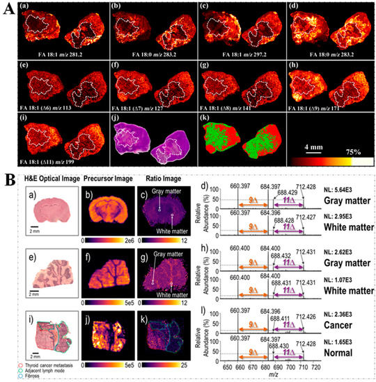 (A) The on-tissue PAA epoxidation strategy combined with MALDI-TOF/TOF-MS platform to map the spatial distribution of FA isomers in tissue sections. Full-MS images of (a) FA 18:1 and (b) FA 18:0 without epoxidation as well as (c) epoxy-FA 18:1 and (d) FA 18:0 after on-tissue epoxidation. MALDI-TOF/TOF-tandem MS images of (e) FA 18:1 (D6), (f) FA 18:1 (D7), (g) FA 18:1 (D8), (h) FA 18:1 (D9), (i) FA 18:1 (D11). (j) The H&E stained histological image. (k) Segmentation pipeline analysis of the MS2 data: region rich in cancer cells (red) and region containing few cancer cells with necrosis (green). The left side tissue section was from untreated sample while the right side tissue section was from sample treated with radiation in all the images. (reproduced from Ref. [5] with permission from the Royal Society of Chemistry); (B) DESI−MS coupled with the 193 nm UVPD for characterization of phospholipid isomers in tissue sections. H&E optical images of different tissue sections, including (a) mouse brain, (e) human brain, and (i) lymph node with thyroid cancer metastasis. DESI-MS ion image of m/z 798 in different tissue sections, including (b) mouse brain, (f) human brain, and (j) lymph node with thyroid cancer metastasis. (c) DESI-UVPD ratio image of the ratio of the summed intensities of the UVPD double-bond diagnostic ions (Im/z 660 + 684)/(Im/z 688 + 712), (g) DESI ratio image of the ratio of the summed intensities of the UVPD double-bond diagnostic ions (Im/z 660 + 684)/(Im/z 688 + 712), and (k) DESI intensity ratio image of (Im/z 684/Im/z 712). Expanded region of UVPD mass spectra of (d) the white and gray matter, (h) the white and gray matter, and (l) cancerous and normal parts of tissue. (reproduced permission from Ref. [87]. Copyright (2018) American Chemical Society).