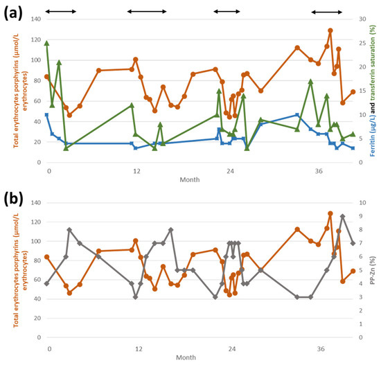 EPP patient’s biological parameters. Black arrows indicate treatment periods. (a) Total erythrocytes porphyrins (µmol/L erythrocytes, dots), ferritin (µg/L, squares) and transferrin saturation (%, triangles); (b) total erythrocytes porphyrins (µmol/L erythrocytes, dots) and PP-Zn (protoporphyrin-Zn, %, diamonds). EPP: erythropoietic protoporphyria.