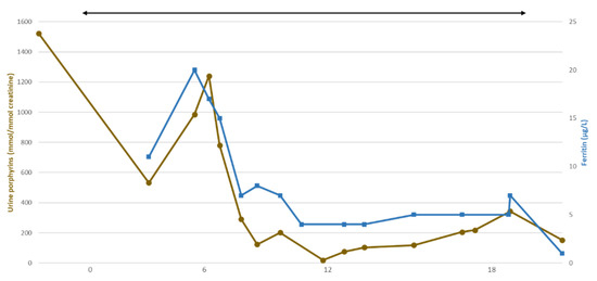 CEP patient’s biological parameters. Black arrow indicates iterative phlebotomies every 1 or 2 months. Total urine porphyrins (mmol/mmol creatinine, dots), ferritin (µg/L, squares). CEP: congenital erythropoietic porphyria.