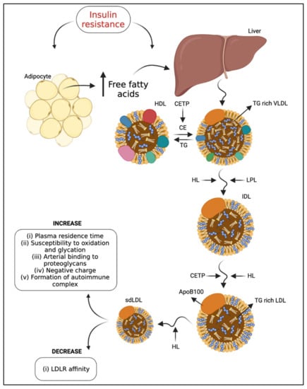 Insulin resistance-induced dyslipidemia is characterized by the presence of small, dense LDL (sdLDL) particles, [4] which have a more substantial atherogenic potential compared to other LDL subfractions [22]. As insulin resistance becomes more severe, the size of LDL particles decreases [23]. Moreover, sdLDL circulation times are longer due to their relatively reduced affinity to LDL receptors (LDLR) [24], secondary to apoB-100 glycation [25] (see the section below). In addition, sdLDL displays increased affinity to the arterial wall [4], contributing to atherogenesis [26].