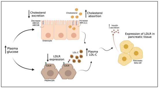 Effect of increased glucose on LDL-C metabolism and insulin secretion. In enterocytes, the increase in plasma glucose causes a decrease in cholesterol excretion consecutive to the reduction in the expression of ABCG5 and ABCG8. On the other hand, there is an increase in cholesterol absorption as a result of the high expression of NPC1L1. Both mechanisms contribute to raised plasma LDL-C levels. The increase in plasma glucose also reduces expression of LDLR in hepatocytes, another mechanistic pathway contributing to the increased plasma concentration of LDL-C. Such elevated plasma LDL-C levels together with the high expression of LDLR in pancreatic beta cells stimulate insulin secretion [2]. LDLR: LDL receptor, ABCG5/8: ATP Binding Cassette Subfamily G Member 5/ABCG8: ATP Binding Cassette Subfamily G Member 8, NPC1L1: Niemann–Pick C1-like 1 protein, LDL-C: LDL cholesterol.