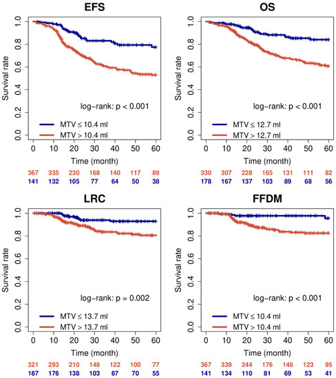 Kaplan-Meier curves for MTV with respect to EFS, OS, LRC, and FFDM.