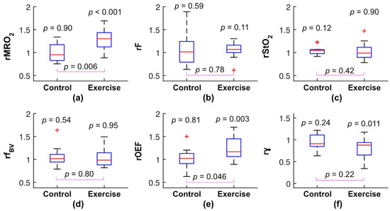 Optically measured changes in resting calf muscle metabolic rate of oxygen (rMRO2; (a)), blood flow (rF; (b)), tissue oxygen saturation (rStO2; (c)), blood volume fraction (rfBV; (d)), oxygen extraction fraction (rOEF; (e)), and venous/arterial ratio of blood monitored by FD-DOS (rγ; (f)) between the 3-month and baseline timepoints for the control (n = 14) and exercise (n = 14) peripheral artery disease (PAD) population groups. All changes are expressed as 3-month to baseline ratio, and all boxplots show the median and interquartile range (the + symbol in all boxplots indicates individual data points either greater than the third quartile plus 1.5× (interquartile range) or less than the first quartile minus 1.5× (interquartile range)). p values above the boxplots indicate whether the median change was different from 0, and p values between the boxplots indicate whether the median change in the exercise group is different from the median change in the control group.