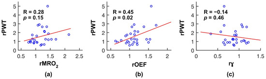 In a secondary analysis, we used linear regression to assess the correlations of changes in MRO2, OEF, and γ with improvement in exercise performance (Figure 2). The relative change in peak walking time (rPWT) was not significantly correlated with rMRO2 (R = 0.28, p = 0.15; slope of best fit line = 0.9 (95% CI, −0.3 to 2.1)), but was correlated with rOEF (R = 0.45, p = 0.02; slope of best fit line = 1.7 (95% CI, 0.4 to 3.0)). There was no correlation between rPWT and rγ (R = −0.14, p = 0.46; slope of best fit line = −0.7 (95% CI, −2.5 to 1.2)). Additionally, in another secondary analysis, there was no correlation between rMRO2 and rγ (R = −0.27, p = 0.17; slope of best fit line = −0.39 (95% CI, −0.96 to 0.18)).
