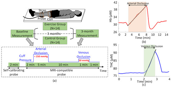 Specifically, we incorporate the techniques of arterial-occlusion and venous-occlusion diffuse optical spectroscopy (i.e., AO-DOS and VO-DOS) into a randomized clinical study to ascertain the effects of a 3-month supervised exercise-training program on resting calf muscle MRO2 and F. Using Fick’s law [21,22], we calculated OEF from MRO2, F, and blood hemoglobin (C) measurements. The exercise training effects on resting calf muscle tissue oxygen saturation (StO2), total hemoglobin concentration (THC), and blood volume fraction (fBV = THC/C) were also determined from FD-DOS and C measurements.