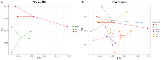 The principal coordinate analysis (PCoA) with weighted Unifrac distance was performed in two comparisons: (1) between normal control (Nor) group and CPA-treated negative control (NC) group, and (2) between the NC and the groups supplemented by β-glucan (PC), PGS, and PG. In the first comparison, the Nor and NC groups were segregated, but they had high variance within groups (Figure 1A). When we compared NC to other groups that are immunosuppressed with CPA, the positive control with β-glucan (PC) and PG2 groups had no segregation with the NC group (Figure 1B). On the other hand, PGS1, PGS2, and PG1 groups were distinguished from the NC group, where the PGS2 group was clustered at a shorter distance compared with those in the other groups.