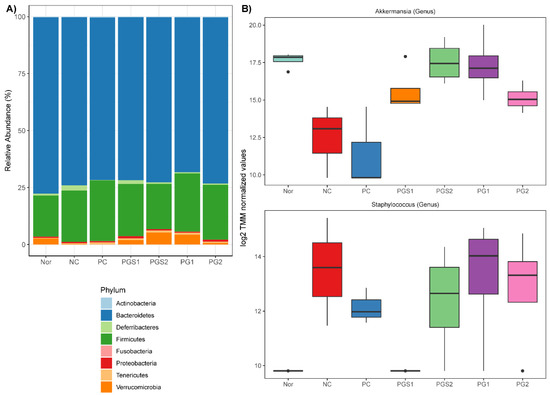 The predominant microbes at the phylum level were Bacteroidetes and Firmicutes. They accounted for more than 70% and 20% of microbes (Figure 2A), respectively. The Bacteroidetes, when observed in the NC group, showed a decrease in abundance but an increase in PG-diets. Alongside this, the Firmicutes showed a substantial increase in abundance of PG-diets groups. Since only limited information was available regarding the differences at the phylum level, we compared the abundance of the NC group to those of PC, PGS, and PG treated groups to detect supplement of PGS associated microorganisms at the genus level. By using the weighted trimmed mean of the log expression ratios (trimmed mean of M-values (TMM)), the NC group associated microorganisms were Akkermansia and Staphylococcus (FDR < 0.05) (Figure 2B). The abundance of Akkermansia decreased in the NC group compared to the Nor group. When immune-suppressed mice had a supplement with PG-diets, the abundance of Akkermansia increased. There were significant differences within the NC group and PGS2 and PG1 groups (p-value < 0.05). On the other hand, the abundance of Staphylococcus increased in the NC group compared to the Nor group. Dissimilar to Akkermansia, there was no distinct difference within the groups, but a decrease in Staphylococcus abundance was observed in PC and PG-diets groups. We also carried out the Analysis of Composition of Microbiomes (ANCOM) implemented through the QIIME2 ANCOM plugin to investigate differentially abundant microorganisms at phylum and order levels and compared it with the results of edgeR. Nine phyla were identified, but Verrucomicrobia were the only phylum to show a significant change in response to treatments. Moreover, this observation was consistent for the taxonomic classification at the order level, with Verrucomicrobiales being significantly different among treatments (Figure S2).