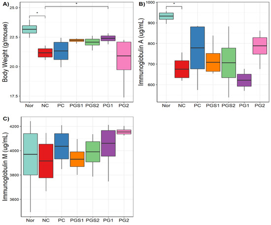 A decrease in body weight is considered as a side effect of long-term use of CPA treatment. The NC group showed a significant decrease in body weight compared to the Nor group, indicating that the side effects of CPA treatment appeared. According to the statistical t-test, the PG1 group presented a significantly increased body weight. Although PGS1 and PGS2 did not show a significant increase compared to the NC group, they displayed higher body weight than those of the NC and PC groups. In our in vivo study, PG-diets increased body weight that had decreased due to CPA, and a significant effect was found in the PG1 group compared to the NC group, which agrees with the observations in previous reports [16,20]. In addition, we observed that the concentration of IgA was significantly reduced in the NC group compared to the Nor group. However, their levels of PGS1, PGS2, and PG2 groups increased compared to the NC group (p > 0.05). A similar observation was shown in IgM, where the PG-diets groups leveled higher than the NC group. Therefore, our data suggest that CPA caused a significant reduction in body weight and immunoglobulin levels by its toxicity, while PG-diets can prevent the side effects of CPA and improve the conditions of mice treated with PG-diets. These findings indicate that the PG-diets can resist the immunosuppressive effects of CPA.