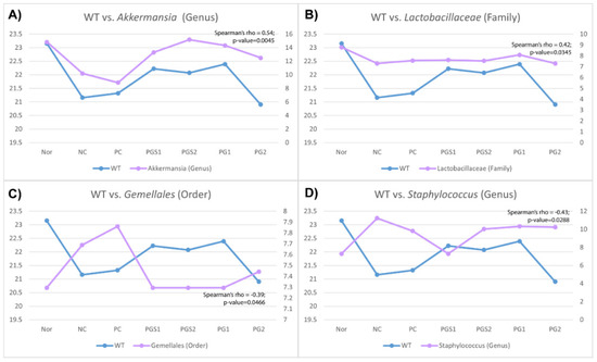 Correlation between immune-related biomarkers and relative abundance of microorganisms. (A) A correlation between body weight and genus Akkermansia, (B) Correlation between body weight and family Lactobacillaceae, (C) Correlation between body weight and order Gemellales, (D) Correlation between body weight and genus Staphylococcus. Akkermansia genus and Lactobacillaceae family were positively correlated, and Gemellales order and Staphylococcus genus were negatively correlated with body weight. The x-axis represents the seven groups, the left y-axis is body weight value (blue), and the right y-axis is the relative abundance value (pink). The Spearman’s rho and the p-value for the correlations were shown in the right top corner.