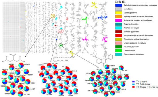 Molecular network of all detected ions using MS/MS data in the negative mode. Nodes from the selected clusters (tricarboxylic acids, linoleic acids, and flavonoids) are labelled with parent masses and displayed as pie charts representing distribution of ion intensities in the non-stressed controls (T1: dark blue), salt stressed (T2: light blue) and Si treated salt stressed samples (T3: red).