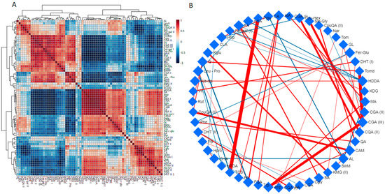 Correlation analyses among detected metabolites. (A) The correlation matric was obtained using the Spearman’s correlation coefficient between each pair of metabolites, the colour scheme corresponds to the colour bar, showing positive (red) and negative (blue) correlations. (B) Debiased sparse partial correlation (DSPC) network shows connectivity between the top 20% correlated metabolites based on p-value, with the cut off at 0.0005. The nodes represent metabolites, the edges represent positive (red) and negative (blue) correlations between metabolites. Edge thickness corresponds to the magnitude of the correlation coefficients. Metabolite abbreviations are provided in Table S2.