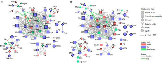 In metabolomics studies, correlation analysis provides a powerful view to understand biological systems where not only individual metabolites are connected, but also their interconnections, hence providing a more comprehensive understanding of the metabolome of the system in question [39]. The global correlation networks of differentially abundant metabolites revealed two main constellations of phenolic compounds (square nodes) and amino acids (circular nodes) interconnections, based mainly on their chemical relatedness (grey edges). The metabolic networks also revealed biochemical relationships (green edges) within several phenolic compounds (naringin—coumaroyl/feruloyl/caffeoyl conjugates) and between different metabolite groups such as organic acids and phenolics (malic acid—naringin—feruloyl quinic acid) (Figure 4).