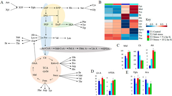 A graphical/topological representation of the intertwined pathways and relative quantification of measured primary metabolites. (A) The pathways incorporated include the phosphate pentose pathway (PPP) (yellow), glycolysis (blue), shikimic acid (green), organic acid/TCA cycle (brown), the fatty acid biosynthesis (grey) and several amino acid biosynthesis pathways. (B) Heatmap showing relative quantification of measured amino acids across non-stressed controls (T1), salt stressed (T2) and Si treated (T3 and T5) plants. Relative levels (integrated peak areas) of organic acids (C), fatty acids (D) and sugars (E) is depicted by bar graphs across non-stressed controls (T1), salt stressed (T2) and Si treated plants (T3 and T5), with error bars Abbreviations: Ara, arabinose; Xyl, xylose; X5P, xylose−5−phosphate; G6P, Glucose−6−phosphate; R5P, Ribose−5−phosphate; 3PG, 3−phosphoglyceric acid; EryP, Erythrose 4−phosphate; PEP, Phosphoenol pyruvate; SKA, shikimate; Pyr, Pyruvate; Cit, Citrate; Keto-G, ketoglutarate; Succ, Succinate; Fum, Fumarate; Mal, Malate; OAA, Oxaloacetate, TCA, Tricarboxylic acid.