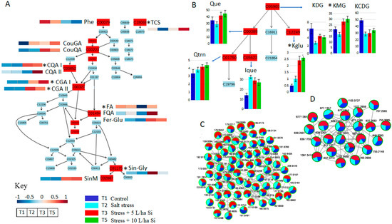 Secondary metabolic pathways and differential changes in corresponding phenolic compounds and their conjugates in non-stressed (T1: dark blue), salt-stressed (T2: light blue), and biostimulant treated salt-stressed (T3: red and T5: green) samples. The metabolite hits in the phenylpropanoid pathway (A) and the flavonoid biosynthesis pathway (B) are highlighted and matched to their corresponding graphical heatmaps representing relative amounts of each metabolite in different treatments. The asterisk (*) on metabolite titles indicate statistically significant differences (t-test: p-value < 0.05) in metabolite levels. (C) and (D), illustrate treatment-based ion abundance in molecular network clusters of cinnamic acids, flavonoids, and their derivatives, respectively.