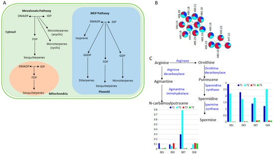 Changes in metabolism of terpenes and polyamines in response to salt stress and Si-biostimulant treatment. (A) A simplified representation of two main terpenes’ biosynthesis pathways: mevalonate pathway, which takes place in the cytosol (green) and the mitochondria (brown), and the 2-C-methyl-D-erythritol-4-phosphate (MEP) pathway which occurs in the plasmid (blue). (B) The relative abundance of the measured terpenes across non-stressed controls (dark blue), salt stressed (light blue) and Si treated plants (red) is presented as pie charts of the molecular network cluster of terpenes and derivatives (see Figure 1). (C) An outline of polyamine synthesis pathways and corresponding graphs showing levels of spermidine and spermine across stressed controls (T1), salt stressed (T2) and Si treated plants (T3 and T5) at all time points. Abbreviations: DMADP, dimethylallyl diphosphate; MEP pathway, 2-C-methyl-D-erythritol 4-phosphate pathway; IDP, isopentenyl diphosphate; FDP, farnesyl diphosphate; GDP, geranyl diphosphate; GGDP, geranylgeranyl diphosphate.
