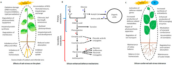 A postulated overview of Si-mitigated alleviation of salt stress effects on tomato plants via modulation of the primary and secondary metabolic pathways. (A) Scheme portraying the detrimental effects of salt stress on a plant. Excess accumulation of Na+ and Cl− ions in the soil, hence an increased absorption causes an imbalance in the uptake of other ions, water and nutrients. Subsequent ionic and osmotic stresses enhance synthesis of ROS, resultant in oxidative damage of macromolecules and photosynthetic equipment. (B) Si-based biostimulant treatment of the salt-stressed plants leads to modifications in the slightly overlapping primary (red) and secondary (blue) metabolic pathways for a coherent defence response. Upregulation of these pathways result in accumulation of osmolytes, enhanced synthesis of enzymatic and non-enzymatic antioxidants, ROS detoxification and repair of the salt-stress induced oxidative damage. Coherent activities of the Si-enhanced defence responses ultimately lead to conferred salt stress tolerance in plants (C). Primary metabolic pathways (blue): glycolysis (1), pentose phosphate pathway (2), tricarboxylic acid cycle (3), amino acid biosynthesis pathways (4) and the secondary metabolic pathways (red): including shikimate pathway (5), phenylpropanoid pathway (6, 7) and flavone and flavonol biosynthesis pathways (8). Abbreviations: G6P, Glucose-6-phosphate; EryP, Erythrose phosphate; PEP, Phosphoenol pyruvate.