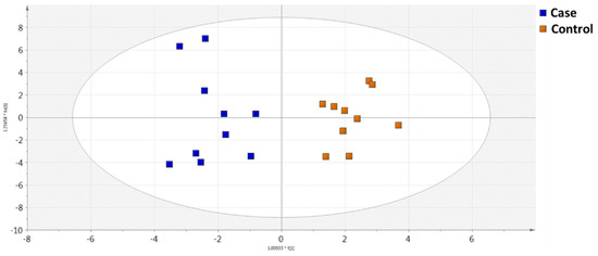 Based on the data acquired by the GC-MS methodology, 84 metabolites were identified and further evaluated by multivariate statistical analysis. Data were normalized by the injection standard values and log (base 10) transformed. Principal component analysis (PCA) was performed in order to assess the analytical system’s suitability and reproducibility (QC cluster), as illustrated in Figure S1 (Supplementary Material). The built models revealed discrimination of the two studied groups. In Figure 1, as can be seen, Orthogonal Partial Least Squares Discriminant Analysis (OPLS-DA) score plot provided a statistically significant differentiation between the case and control groups. The model’s validity was cross-verified by R2X, R2Y, and Q2Y values, which were found to be 0.486, 0.891, and 0.632, respectively, as well as by the model’s accuracy (0.85) and CV-ANOVA value (p = 0.0.25).