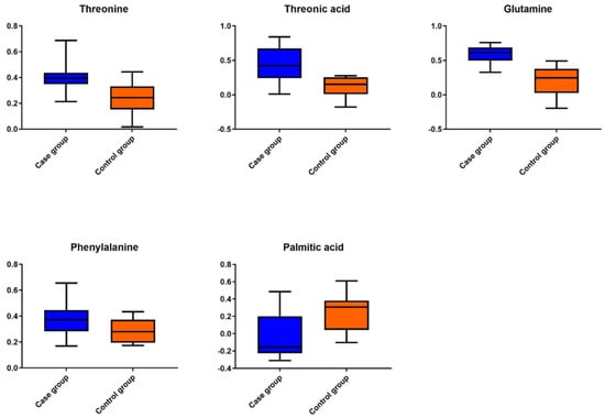 Combining these data with the results from the univariate statistical analysis, five metabolites were found altered in the case samples, namely threonine, threonic acid, glutamine, phenylalanine, and palmitic acid. All of the differentiated metabolites were found to be up-regulated in the case group, except for palmitic acid which was decreased in the case group compared to the control group. Table 1 presents all metabolites found to differ significantly in the plasma of the case group by GC-MS, along with their VIP values, p values, area under the curve (AUC) values, and their respective 95% confidence interval (CI) values and logarithm base two of the fold change (FC).