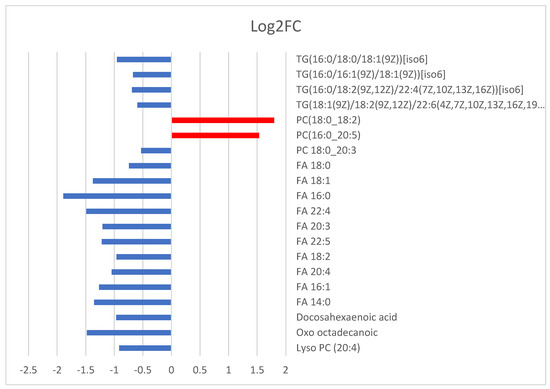 In total, 7 and 25 features in positive and negative ionization modes, respectively, were found by S-plot (see Figure 4a,b) as being statistically significant with p ≥ |0.05|, p(corr) ≥ |0.5|, and VIP > 1 that passed the filter of p-value < 0.05 after performing univariate statistical analysis. The significant features found, and the annotated lipids (MS Level 2, Section 4.7) can be seen in Table 2. From the +ESI data, two lipid classes were found to be affected in the neonate plasma, namely phosphatidylcholines (PCs) and triglycerides (TGs). More specifically, PCs were found to be upregulated, while TGs were decreased in neonates born to Sars-CoV-2 positive mothers. The DDA approach proved highly effective for the identification of lipids in the negative ESI mode. A total of 14 out of 17 compounds were annotated, as can be seen in Table 2. Specifically, fatty acids and PC metabolism seem to be perturbated in neonates of the case group.