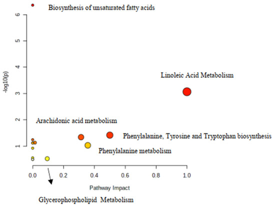 Metabolic pathways indicated by “MetaboAnalyst” 5.0 to be perturbated based on the lipids and aminoacids that were found to be differentiated are shown in Figure 6.