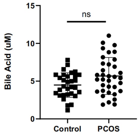 Compared with the control group, the level of total bile acid showed an increasing trend in FF from the PCOS group, but there was no statistically significant difference (p = 0.0640) (Figure 1).