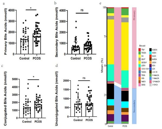 (a) Differences in primary bile acids. (b) Differences in secondary bile acids. (c) Differences in conjugated bile acids. (d) Differences in unconjugated bile acids between the control group and the PCOS group (e) Expression profile of bile acid metabolites in follicular fluid (FF). * p < 0.05, **: Statistical significance; ns = not statistically significant.