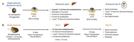Experimental design of the early-life stage (ELS) and adult Japanese quail exposures, adapted from Farhat et al. [13] and Boulanger et al. [14]. ELS and adult Japanese quail were exposed to 8 environmental chemicals (benzo[a]pyrene (BaP), chlorpyrifos (CPF), ethinylestradiol (EE2), fluoxetine hydrochloride (FLX), hexabromocyclododecane (HBCD), lead(II)nitrate (Pb), seleno-L-methionine (SeMe), and trenbolone (TB)) following this experimental design. (A) Embryos were exposed via egg injection on day 0 of incubation. A subset was euthanized on embryonic day 9 and liver samples were taken for omics and chemical residue analysis. To provide sufficient tissue for metabolomics, 3–4 ELS livers were pooled for each replicate (n = 3 replicates). Remaining embryos were incubated until embryonic day 16 in order to monitor apical outcomes. (B) Adults were exposed to a single dose via gavage. A subset was euthanized 4 days later for omics (n = 5) and chemical residue analysis. Remaining individuals were maintained until day 14 in order to monitor apical outcomes.