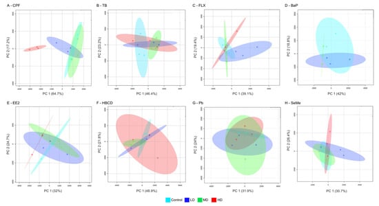 Principal component analysis (PCA) scores plot of the early-life stage (ELS) Japanese quail (JQ) liver metabolome after exposure to chlorpyrifos (CPF, A), trenbolone (TB, B), fluoxetine (FLX, C), benzo(a)pyrene (BaP, D), ethinylestradiol (EE2, E), hexabromocyclodecane (HBCD, F), lead(II)nitrate (Pb, G), and seleno-L-methionine (SeMe, H). JQ were exposed to three doses defined as low dose (LD, dark blue), medium dose (MD, green), and high dose (HD, red).