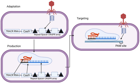 The targeting of bacteriophages through CRISPR is a three-stage process of adaptation, cRNA maturation and interference. During a bacteriophage infection, the bacteria will take a fragment of the bacteriophage genome. This is achieved using a Cas1–Cas2 complex, which is highly conserved in many CRISPR systems, which may also include other proteins depending on the system such as Cas4 in some systems, including type I-A, B and C and type II-B and Cas9 with tracrRNA and Csn2 in type II-A systems, with many other proteins also implicated in adaptation across different CRISPR systems [34,35,36,37]. This complex searches the bacteriophage genome looking for specific features, such as a protospacer adjacent motif (PAM) site adjacent to a target sequence, as this is necessary for CRISPR to target it. Cas9 ensures there is a PAM site adjacent to the target site in type II-A systems [36]. The PAM site is necessary to enable selectivity so that the CRISPR does not cut its own genome at the spacer [38]. When a suitable region is identified, this complex cuts out the region through the nuclease activity of Cas1, which is then incorporated into the CRISPR repeat-spacer array [39]. In this array, there are spacers from the different bacteriophages the bacteria has been infected by in the past; these spacers are flanked by repeat regions with a leader region before the first repeat. Spacer integration happens at the leader proximal end so that the newer infections, closer to the leader, are more strain-specific, whilst the older spacers, which are less specific, may be lost [40]. These spacers are incorporated through a transesterification reaction where the 3’ hydroxyl ends of the spacer attack the top strand leader-repeat junction before attacking the bottom strand leader-spacer junction incorporating the spacer into the array [41]. The first repeat duplicates to get the two flanking repeats of the spacer [42]. The Cas1–Cas2 complex is also important here, guiding the spacers to the site for integration, but how it does this varies across different CRISPR systems [41].