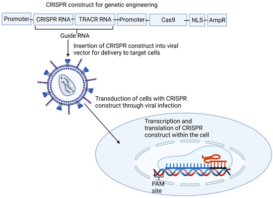 This shows how the type 2 clustered regularly interspaced short palindromic repeats (CRISPR) system is utilized for genetic engineering. Firstly, a construct is made containing all the necessary CRISPR elements, including a guide RNA designed to be complementary to the target region. This is then cloned into a plasmid before being inserted into a viral vector. This vector infects the target cells, transducing the cells with the CRISPR construct, which is then transcribed and translated before forming the complex and cleaving the region of the genome it was designed to target. AmpR, Ampiciline resistance promoter; NLS, nucleic localization signal; TRACR trans-activating CRISPR. Created with BioRender.com.