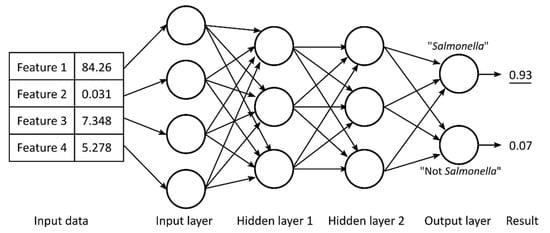 Example of a simple multilayer artificial neural network (ANN) with four input neurons, two fully connected hidden layers of three neurons each, and two output neurons. In this example, the output neuron “Salmonella” has the maximum output value, and thus, the ANN predicts that the input data came from a Salmonella sample.