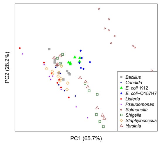 A principal component analysis (PCA) plot revealed strong differences between microbes (Figure 2). Partial group separations are visible for most stains. Salmonella was the only strain that showed complete separation from all other samples. The two E. coli strains clustered together and partially overlapped. The loadings plot of this PCA (Supplemental Figure S1) shows that acetic acid contributed strongly to the observed group separation.