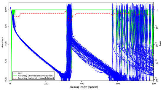Figure 3 shows the training behavior of these models on our dataset. It is interesting to note that the accuracy of the internal cross-validation (solid green lines) reached 100% after less than 30 epochs of training; however, this finding was not accompanied by maximum accuracy in the outer cross-validation (dashed red line). It is, thus, of importance to use outer cross-validation to estimate true accuracies. During further training, internal accuracy stayed at 100%, but loss decreased continuously, and external accuracy increased, until about 300 epochs of training. Then, a steep increase in loss and decrease in accuracy occurred. After further training, better results were obtained until epoch 550, when further accuracy decreases started occurring. At these points, the models get worse when continuing learning through the effect of overfitting. This means that the model is learning the outcomes of the given training samples “by heart” without being able to generalize this knowledge. To avoid overfitting, we need to define ways to stop training before accuracy decreases to find optimal models.