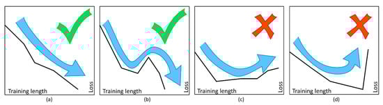 Case (b): Training may continue even if the loss function increases, but only if the new loss value is lower than the maximum loss value from the previous seven epochs of training. Visually, this means the algorithm can “jump” out of narrow and shallow valleys. Without this criterion, training might end when reaching a local minimum, but missing the global minimum.