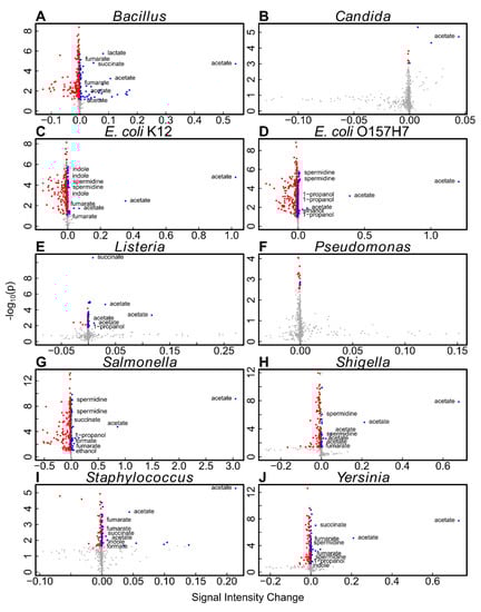 Two-tailed, unpaired one-sample t-tests were calculated for each microbial strain, testing differences of the feature intensity from 0. These tests were repeated for each feature (bin) in the dataset and resulting p-values were corrected for multiple testing using FDR controlling at a level of 20% [31]. Volcano plots were used to plot the negative decadic logarithm of the raw p-values versus the feature intensity after subtraction of a pure medium spectrum as detailed above. Fold changes were not employed in this version of volcano plots as many features of interest were absent in the pure medium, and fold changes are not defined for starting concentrations of 0. Features that were significantly increasing were identified using database searches in the Human Metabolome Database (http://hmdb.ca/, accessed on 20 November 2021) and the Biological Magnetic Resonance Data Bank (BMRB, http://bmrb.wisc.edu/, accessed on 20 November 2021) and measurements of pure compounds.
