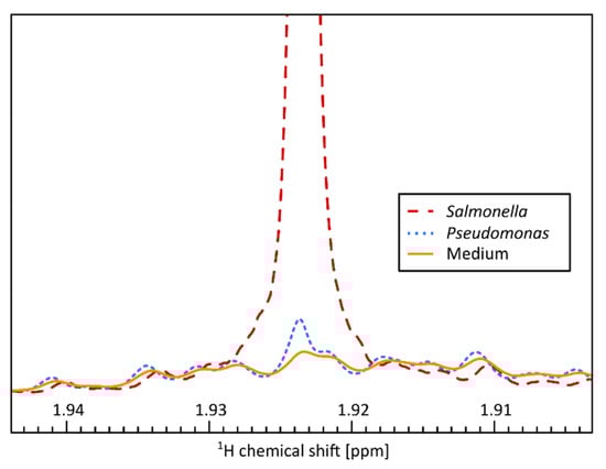 To further investigate metabolic differences between the analyzed microbes, we performed additional untargeted analyses. PCA analysis revealed partial or complete group separation for most microbial strains (Figure 2). Loadings plot analysis revealed that acetic acid was strongly contributing to this separation, indicating it is present at higher levels after growth of microbes such as Salmonella and E. coli (Figure S1). Statistical analysis indeed revealed significantly elevated levels of acetate for all analyzed microbes except for Pseudomonas (Figure 5). A closer analysis of the NMR signal of acetate (Figure 6) revealed that acetate is visibly produced during growth of Pseudomonas when compared to a medium sample, but at much lower rates than in microbes such as Salmonella. This small release of acetate did not reach the significance level in the presented study though. Aerobic production of acetate has been reported for Bacillus [12], Candida [13], E. coli [14], Listeria [15], Salmonella [16], Shigella [17], Staphylococcus [18], and Yersinia [19].