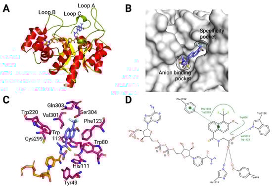 The first three-dimensional structure solved for AKR1B10, the ternary complex of AKR1B10/NADP+/tolrestat (PDB ID 1ZUA, Figure 2), was elucidated in a joint work by the groups of Parés/Farrés and Fita, and is yet the one with the highest resolution (1.25 Å). It illustrates the paradigm of a non-specific ARI binding to AKR1B10, with only positions 301 and 303 differing between AR and AKR1B10 for residues interacting with the compound []. The structure showed the (α/β)8 TIM barrel topology characteristic of the AKR superfamily, with the NADP+ cofactor bound in the interior of the barrel in an extended conformation (Figure 2A,B). Protruding from the barrel core, loops A (residues 112–136), B (residues 216–227) and C (residues 299–310), the most divergent in AKRs and conferring substrate specificity (Figure 2B), are forming the “lid” of the active site. Tolrestat interacts—through its carboxylic acid (CA) moiety—with the anion-binding site residues Tyr49, His111 (both along with Asp44 and Lys78 form the catalytic tetrad), and Trp112, near the positively charged nicotinamide ring of the cofactor (Figure 2C,D). The methoxy-trifluoromethyl-naphthalen moiety of tolrestat is lined by residues at the base of loops A and B (Trp112, Phe116, Phe123, Trp220) and by loop C (Cys299, Val301, Gln303). By comparison to AR, the latter pocket has also been named as “specificity pocket” (SP, Figure 2C).