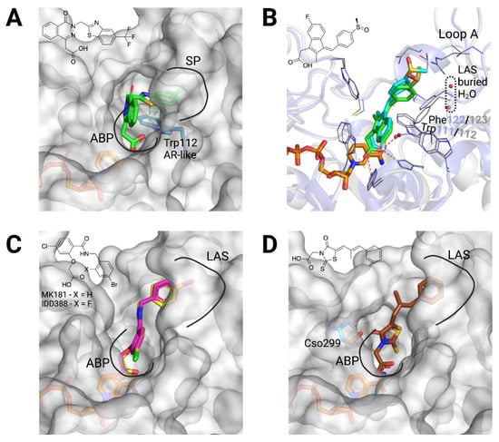 Regarding CAIs solved in complex to AKR1B10 holoenzyme (Table A1), several of them are also ARIs and bind AKR1B10 very similarly to AR, although with some exceptions. Tolrestat binding has already been considered in the previous section. Zopolrestat is also opening the SP in AKR1B10 analogously to in AR, through a π-π stacking interaction with Trp112 (Figure 4A). Sulindac, a non-steroidal anti-inflammatory drug (NSAID) previously reported to inhibit cyclooxygenase-2 (COX-2), AR and AKR1C3 [,], displays a mode of binding essentially equivalent in the two enzymes, stacking towards the base of loop A. However, the stacking interaction is different given by Phe122/Phe123, and two buried and ordered water molecules are present in the LAS in AKR1B10 but not in AR (Figure 4B). Regarding the mentioned exceptions, IDD388 and MK181 are known to open the SP in AR similarly to zopolrestat [], but in AKR1B10, instead, they occupy the LAS bound in an extended conformation (Figure 4C). Lastly, epalrestat, in both structures with AR and AKR1B10 (PDB ID 4JIR and 4JIH, respectively), has not precise coordinates for the phenyl moiety and part of the linker to the CA moiety. Despite this, in AR, with no open LAS in the structure, it is expected that epalrestat may bind in a similar way as sulindac. Meanwhile, in AKR1B10, we can manually model epalrestat with its phenyl moiety occupying the LAS (Figure 4D).