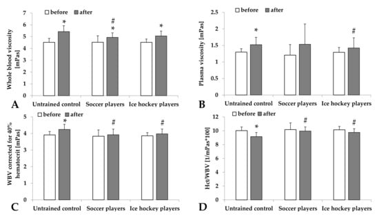 Changes of whole blood viscosity (WBV [mPas]) (A), plasma viscosity (PV [mPas]) (B), WBV corrected for 40% hematocrit (Hct) (C), and Hct/WBV ratio (D) in untrained control group and groups of professional soccer players and ice hockey players before and after the standardized physical exercise load by spiroergometry. Means ± S.D.; * p < 0.05 vs. before, # p < 0.05 vs. untrained.