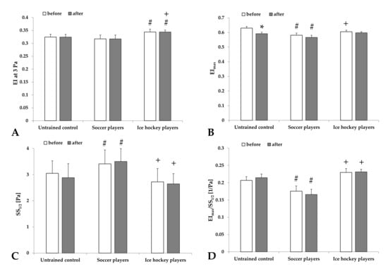 Changes of red blood cell deformability parameters: the elongation index at 3 Pa shear stress (EI at 3 Pa) (A), the maximal elongation index (EImax) (B), the shear stress at half-EImax (SS1/2 [Pa]) (C), and EImax/SS1/2 ratio (D) in untrained control group and groups of professional soccer players and ice hockey players before and after the standardized physical exercise load by spiroergometry. Means ± S.D.; * p < 0.05 vs. before, # p < 0.05 vs. untrained group, and + p < 0.05 vs. professional soccer players.