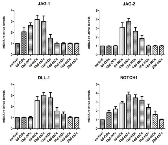 The expression pattern of Notch ligands and receptors. The expression of JAG-1 and NOTCH1 mRNA was gradually upregulated throughout the otic progenitor differentiation, whereas JAG-1 was downregulated during the mid-stage (day 14) and NOTCH1 was downregulated in the final stage (day 20) of hair cell differentiation. JAG-2 and DLL-1 mRNAs were detected at the early stage of hair cell differentiation, but their expression was downregulated by the mid-later stage of the differentiation. The statistical results were significant (p < 0.05). Control: undifferentiated hESCs; 6d-OPs/12d-OPs: cells on day 6/12 of otic progenitor differentiation; 5d-HCs/10d-HCs/12d-HCs/14d-HCs/16d-HCs/18d-HCs/20d-HCs: cells on day 5/10/12/14/16/18/20 of hair cell differentiation.