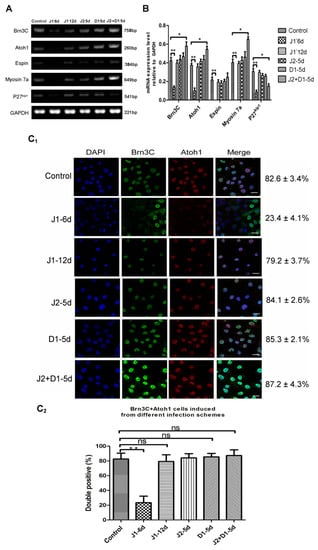 Analysis of hair cell- and supporting cell-specific markers in cells from six infection schemes. (A) RT-PCR analyses for the expression of markers specific for hair cells (Myosin7a, Brn3c, Atoh1, and Espin) and supporting cells (P27 kip1) in cells from six infection schemes. (B) Semi-quantitative analysis of the expression of specific genes using Image J and GraphPad. Expression values are relative to those of GAPDH and are presented as the mean ± SD (n = 3). * indicates p < 0.05; ** indicates p < 0.01. (C1) Co-expression of Atoh1 (red) and Brn3c (green) in cells induced from six infection schemes. Scale bar: 20 μm. (C2) Percentage of Brn3C/Atoh1 double-positive cells in total cells induced using different infection schemes. Error bars represent the SD (n = 5). (D1) Co-expression of Myosin7a (red) and Brn3c (green) in cells induced using the six infection schemes. Scale bar: 20 μm. (D2) Co-expression of Brn3C and Myosin 7a in total cells induced using the different infection schemes. Error bars represent the SD (n = 5). (E1) Co-expression of Espin (red) and Brn3c (green) in cells induced using the six infection schemes. Scale bar: 20 μm. (E2) Percentage of Brn3C/Espin double-positive cells in total cells induced using the different infection schemes. Error bars represent the SD (n = 5). Control: cells infected by lentivirus with NC-shRNA on day 6 of otic progenitor differentiation; J1-6d/J1-12d: cells infected with lentivirus harboring JAG-1-shRNA2 at day 6/12 of otic progenitor differentiation and harvested for analysis at day 20 of hair cell differentiation; J2-5d/D1-5d/J2+D1-5d: cells infected with lentivirus harboring JAG-2-shRNA4/DLL-1-shRNA3/JAG-2-shRNA4 + DLL-1-shRNA3 at day 5 of hair cell differentiation and harvested for analysis at day 20 of hair cell differentiation.