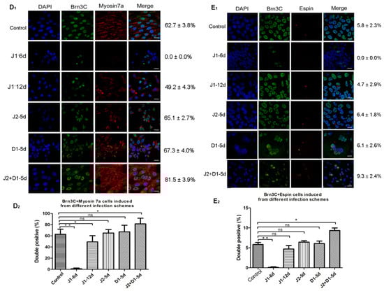 Subsequently, immunofluorescence staining was performed on cells induced to undergo hair cell differentiation for 20 days, using antibodies specific for Atoh1, Brn3c, and Espin (targeting proteins specific to hair cells) to analyze the effects of Notch ligands on in vitro hair cell differentiation. The results showed that all cells expressing Brn3c were immunolabeled by Atoh1. The rate of Brn3c/Atoh1 double-positive cells from the J1-6d infection scheme was significantly lower than that of the cells infected with NC-shRNA. There was no significant difference in the percentage of Brn3C-Atoh1 double-positive cells between any of the four infection schemes and the control scheme (Figure 3C1,C2). Moreover, the fluorescence intensities of Brn3c and Atoh1 in the Brn3c/Atoh1 double-positive cells from the J2+D1-5d infection scheme were much higher than the other four infection schemes. This was consistent with differences in Brn3c and Atoh1 expression among the five infection schemes, as shown in Figure 3B. Cells from the five infection schemes were also simultaneously labeled with antibodies specific for Brn3c and Myosin7a. As shown in Figure 3D1,D2, Myosin7a-positive cells were not detected in the J1-6d infection scheme. The percentage of cells co-expressing Brn3c and Myosin7a in the total cell population from the J1-12d infection scheme and the fluorescence intensity in some Myosin7a-positive cells were slightly lower than those of the cells infected with NC-shRNA. In addition, the fluorescence intensity of Myosin7a in some Myosin7a-positive cells from the J2+D1-5d infection scheme was significantly higher than that of the cells infected with NC-shRNA, while there was no significant difference in the positivity or fluorescence intensity between the other two infection schemes (J2-5d and D1-5d) and the control scheme. Then, cells from the five infection schemes were analyzed for the co-expression of Brn3c and Espin as shown in Figure 3E1,E2. Epsin was detected in cells from the control, J1-12d, J2-5d, D1-5d, and J2+D1-5d infection schemes, but was not detected in the J1-6d infection scheme. Espin was mainly distributed in bundles at one side of the positive cell, resembling stereociliary bundles. The rate of Brn3C/Espin double positive cells from the J2-5d and D1-5d infection schemes was not significantly different from that of the cells infected with NC-shRNA (Figure 3E1,E2). Only the percentage of Espin-positive cells in the J2+D1-5d infection scheme was higher than that of the cells infected with NC-shRNA (p < 0.05).