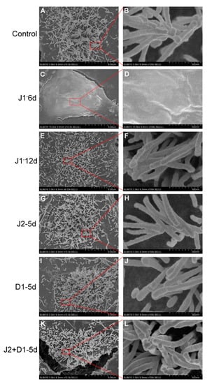 Scanning electron microscopy (SEM) analysis of hair cell-like cells from six infection schemes. (A,B) Stereocilia-like structures on the surface of hair cell-like cells induced from cells infected with NC-shRNA on day 6 of otic progenitor differentiation as the representative of all controls (Control). (C,D) No stereocilia-like structures were detected on the surface of hair cell-like cells induced using the J1-6d infection scheme. Stereocilia-like structures were detected on the surface of hair cell-like cells induced using the J1-12d (E,F), J2-5d (G,H), D1-5d (I,J), and J2+D1-5d (K,L) infection schemes.