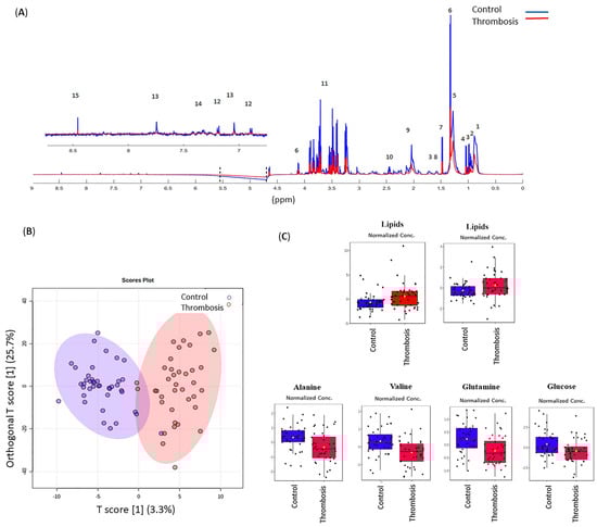 (A) 1H-NMR CPMG spectra illustrating differences between thrombosis and control group. The identified metabolites were: 1. Fatty acyl chain terminal methyl group hydrogens -CH3; 2. Isoleucine; 3. Leucine; 4. Valine; 5. Lipids CH3(CH2)n; 6. Lactate; 7. Alanine; 8. Fatty acyl chain hydrogens from the -CH2- group next to the carboxyl group, as in CH2CH2C(O); 9. Fatty acyl chain CH2CH=; 10. Glutamine; 11. Multiple glucose hydrogens; 12. Tyrosine; 13. Histidine; 14. Phenylalanine; 15. Formate. The HDO (δ 4.70–5.50) regions were removed before the analyses, indicated with the dotted lines. The inset shows the expanded (δ 6.50–8.50) spectral regions; (B) Multivariate OPLS-DA; (C) Relative metabolite levels (measured as peak intensities) by VIP score. The black dots represent the metabolite levels in all samples, and the yellow diamond represents the average value. Patients (Thrombosis) are illustrated in red, and controls in blue.